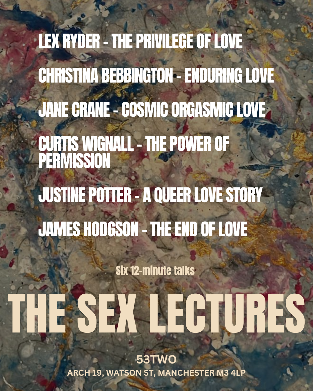 These lineups could change as impermanence is the name of the game. The event is 7.30 pm - 10 pm, you're welcome to arrive from 7 pm. The mingling is part of the fun, connecting, and building sex-positive community. After the event, we move to the bar at 53Two, to continue the conversation and meet some of the speakers.